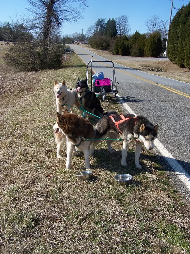 We also passed a field full of about 20 or so cows. I saw them from a distance and thought "oh great, now all my team is gonna go nutzo". Zorro, who is usuallly all work and full blown in harness suddenly perked up, tail and ears held high. Of course Calamity (who needs some serious On-By training) wanted to stop and have a sniff... eh a BITE maybe LOL Stormer and Waylon were great and didnt aknowledge the cows much. The cows stuck their heads over the fence as I was yelling at Calamity to "LEAVE IT, ON BY CALAMITY" the entire stretch of fence and they actually were RUNNING along the fenceline! weird! I had never seen cows do that, but they sure seemed interested. I mumbled as I pushed the rig along as fast as I could "dang cows, go away! we dont need no groupies!". We got to the intersection, took another longer break with some water as I sat down with them and gave them a few head scratches, hugs and belly rubs and also checked their feet, which all was fine. After about 15 minutes and alot of weird looks by spectators, we turned around and started the way again.