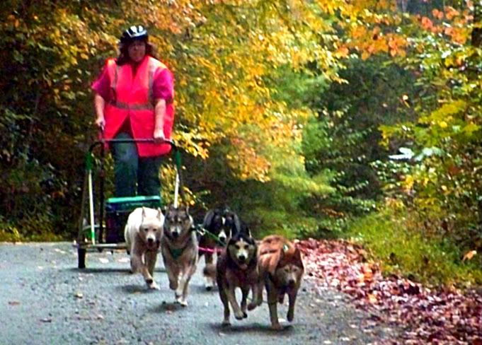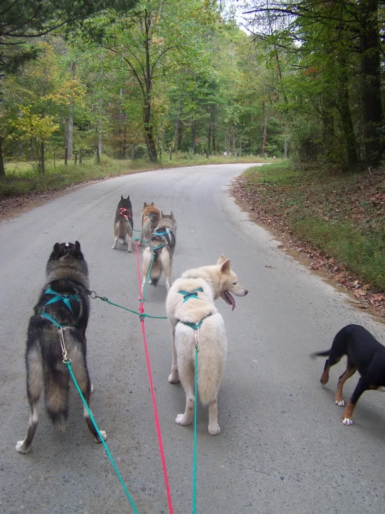 I boiled the dog's up some soup (grounded chicken and water) and gave the left overs and some chicken backs to all the pups and got ready for the run. Mom put on some bacon, eggs and bologna and we sat down for a wonderful breakfast after harnessing the dogs. Our neighbors were awake by this time and we chatted about the newfound sisters and how terrible it is that ANYONE could set out puppies. Even worse, is that they set them out right when campers will stop coming once it gets colder, so there is no one to keep feeding them. We made the decision to take them home, take the other two girls I had found in the night to the animal shelter and maybe keep Autumn. I hooked everyone up and they were even more riled up than the morning before. It was hard getting the snubline to realese because they had pulled so hard against it, but we finnaly took off and mom took some pictures of us coming down to the bridge at camp.