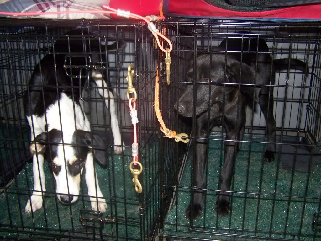 A black and white one, this time I was sure it had to be the one up on the hiker's ridge and called her to me with a peice of chicken in my hand left over from supper. She was very shy, although I could see her tail wagging a little as I threw the peices down. I threw one closer to me and as she went to get it, I nabbed her by the neck. It was probably the only way I would have caught her, considering I was running out of chicken and my dogs were still screaming and lunging (it was supposed to be quiet time). I put her in a crate with her other black sister and gave them the rest of the chicken and taters. My neighbors were still up and had witnessed me catching the puppies and went back to their camp after we talked and I told them sorry for all the ruckus my dogs were making, but they were very nice and said it was not a problem at all and went back to their camp. Autumn seemed different, more relaxed.. like she had accomplished getting her 'family' back together. She layed down in front of the crates and went to sleep, and I crawled back into the van and did the same. I woke a few hours later to a light rain and went outside and covered the crate up. They were all asleep, curled up together with a full tummy, so I went back to bed. I set my alarm for 7 am but for some reason it never went off, but the dogs woke me up at 6:30 instead! It was like they knew what time I was to get up and get ready. I went outside and they were playing and pawing at each other, fully replenished from a good (yet eventful) night's sleep.