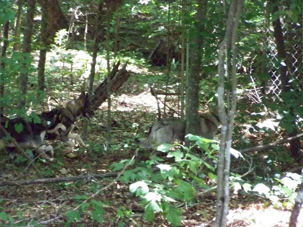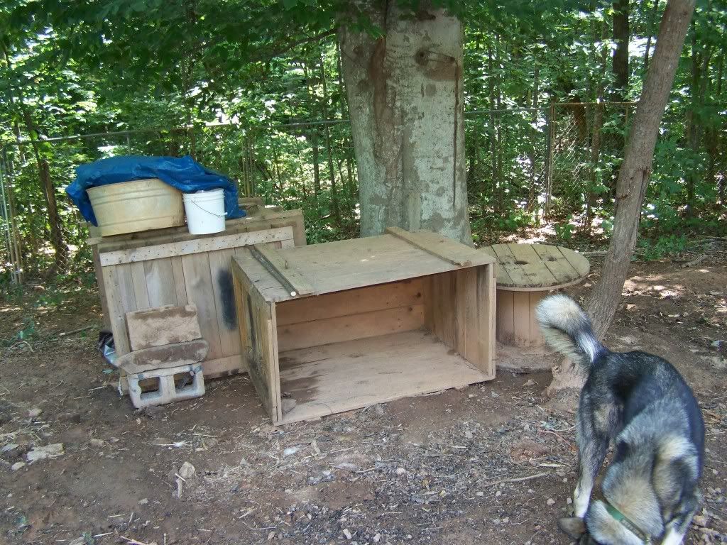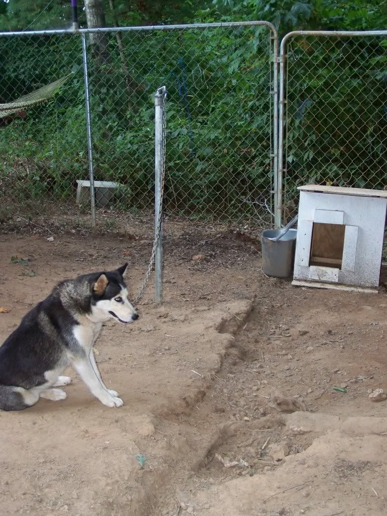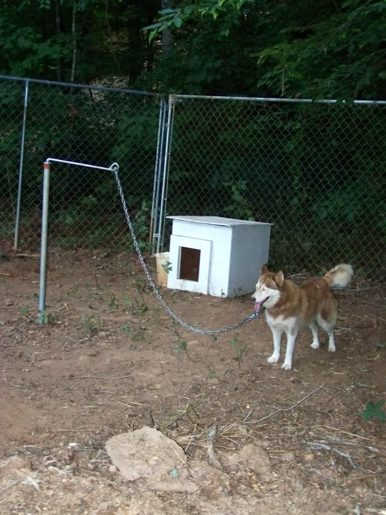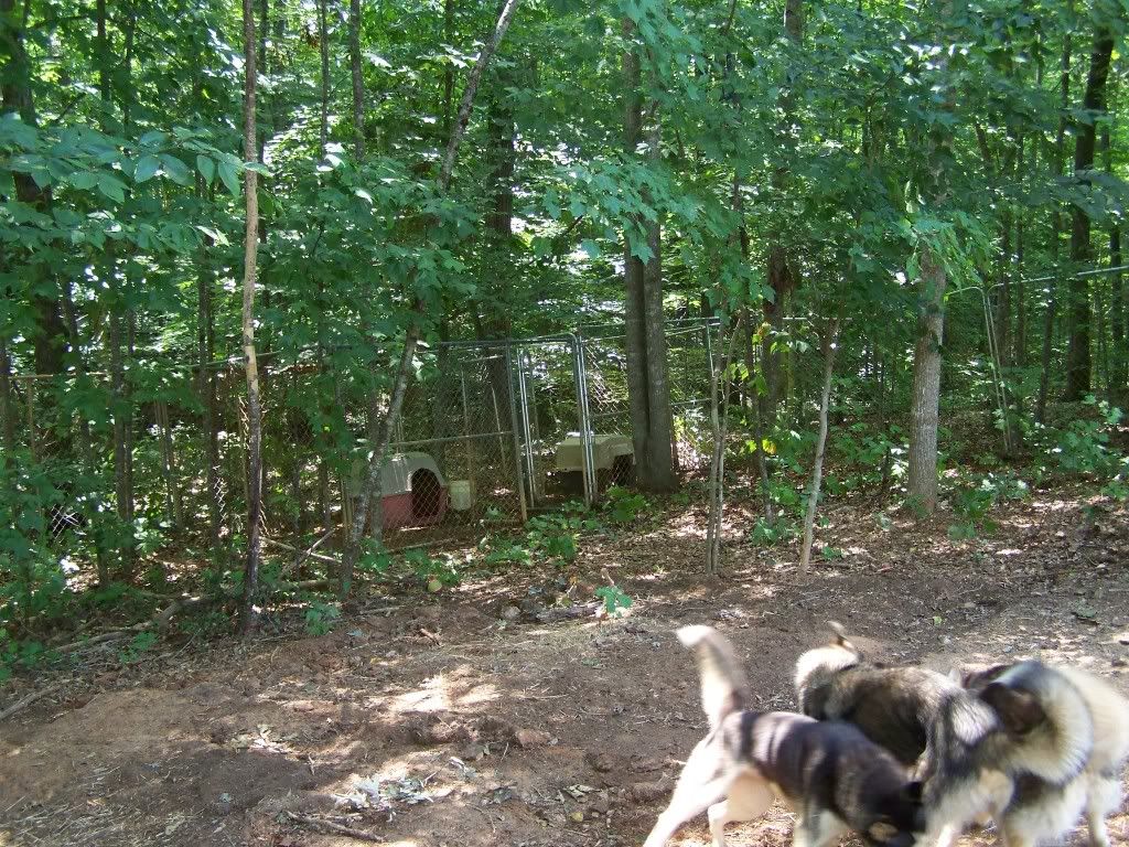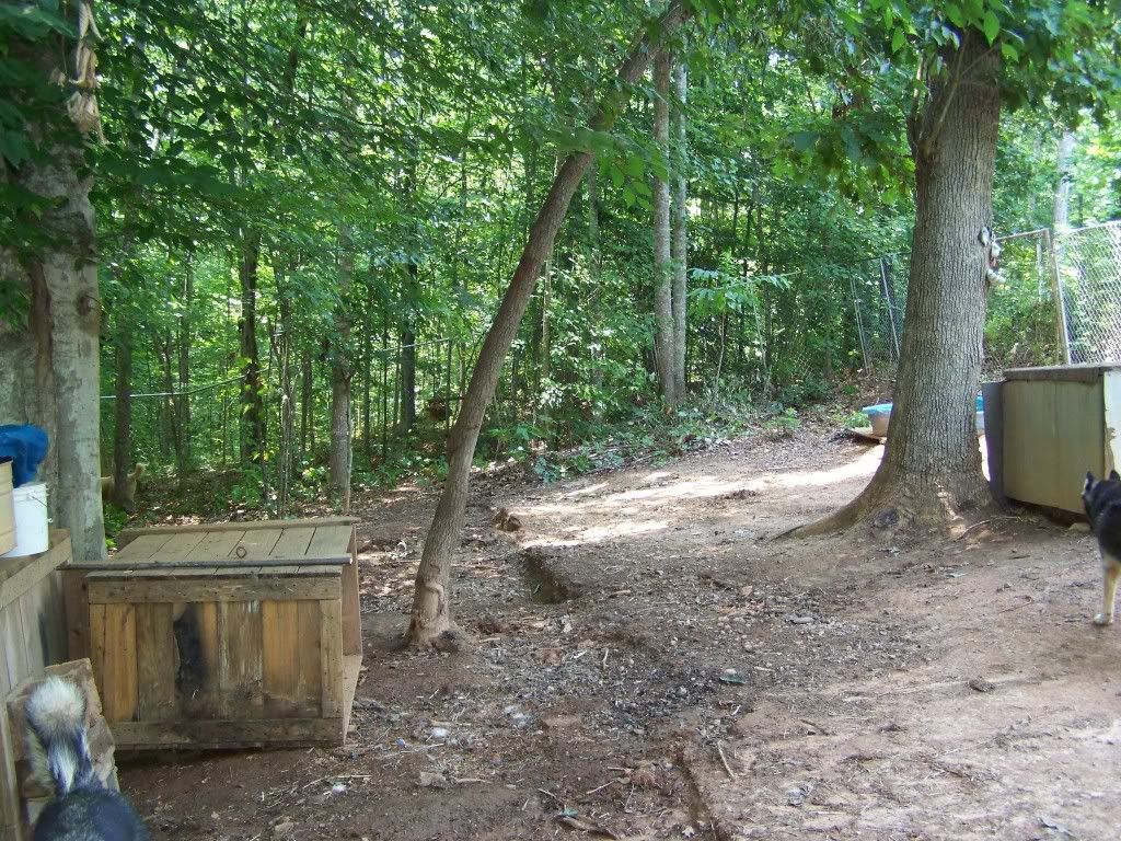So besides sittin' around and singing the summertime blues, we've been hard at work on taking our entire kennel setup apart (in 10x10x6 sections) and turning it into one HUGE dog yard further back in the woods (to prevent flooding) but kept three kennels, and put three 'sled dog style' stakeouts up. Majority of the mushing kennels this far south are small and do not require dog yards, and if they do they usually use kennels like I had. After spending much of my winter at a friends kennel in VA (and her dog yard is all stakeouts like the ones they use in large northern kennels) I fell in LOVE with them. For some reason the dogs are always tidy about where to poop and even when it pours, little mud is made - unlike inside individual kennels. I have found in my experience that kennel panels create a wall when it rains with all the mud. In a stakeout (where the chain is lifted off the ground on a pole) I noticed there was nothing allowing the mud to build up on.. WIN!