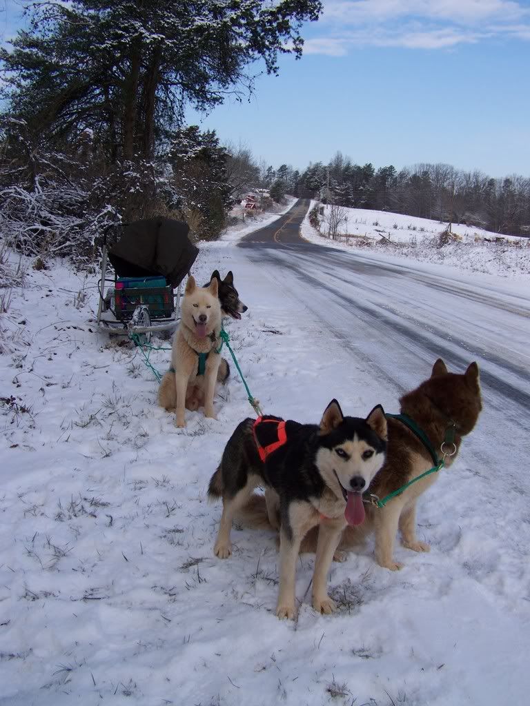 I told them "Wait!" and "Line Out" and they followed it like a dream. They did this for a good 15 minutes, and I was really excited. I would really love a team that will wait on me untill *I* am ready to go. I hopped on the rig and we took off down the driveway, and up the hill with ease. I had to peddle a few times, but nothing like I had to do on the trike, GOD I was so happy to have my rig!