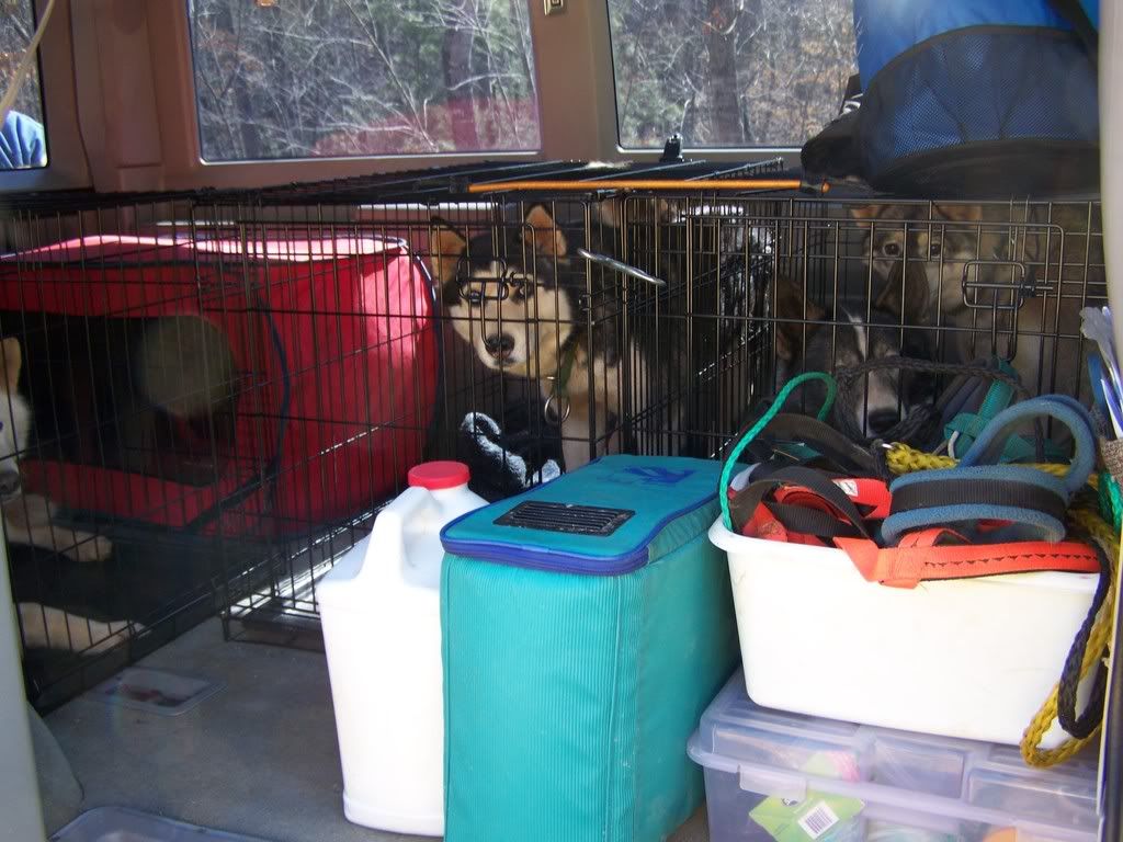 Needless of the weird things trying to hinder me from running, It seemed to have all came together nicely. Everyone loaded up fine, (in my new crates I bought) and the run itself was exceptional. Calamity and Storm flipped back their ears when I directed commands and took them with ease, and there was only a small injury to gloria's nail. I put booties on her back feet, but she lost one within 5 feet of taking off but managed to keep the other on all the way back to the van (on the foot with the hurt nail). We did come across about 5 dogs on the trail, but we passed the majority of them pretty well, although Calamity really needs some 'leave it' training. This is the first hookup Calamity has been on since she has been in season (2 months early, I might add) and I couldnt have expected more from her.